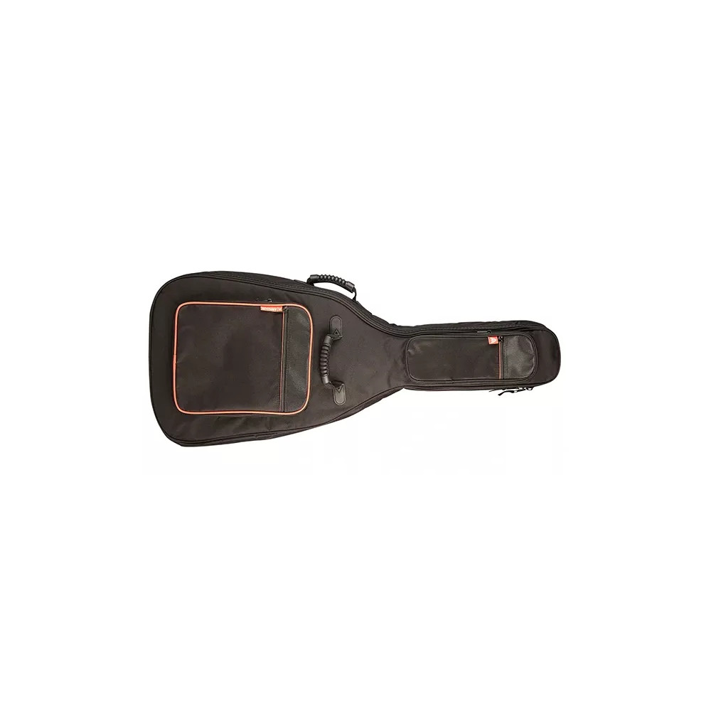Armour ARM 1550W je povlak pro akustickou (westernovou) kytaru. Díky své velikosti je možné ho použít jak pro 6strunné tak i pro 12strunné modely akustických kytar typu dreadnought. Nabízí voděodolný materiál 600D a atraktivní černý design s oranžovými prvky. Je vybaven masivními 10 mm zipy, vnější kapsou na příslušenství, menší kapsou u hlavy nástroje, podporou krku nástroje, gumovým držadlem a spodní gumovou ochranou nástroje při postavení povlaku. K přenášení nástroje v povlaku můžete využít ucho, ramenní popruhy, nebo jej můžete nosit jako batoh na zádech. Polstrování 12 mm nabízí skvělou ochranu vašeho nástroje před poškozením.