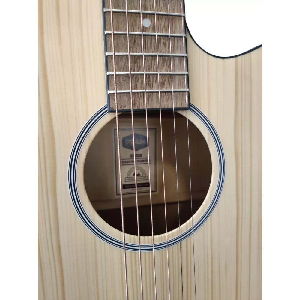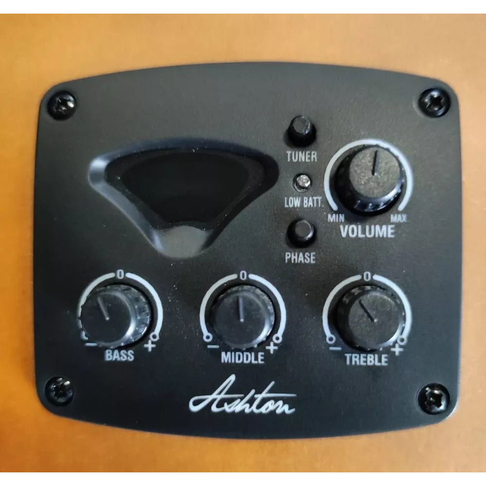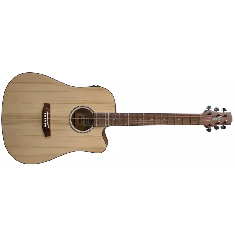 Ashton D20SWCEQ NTM je elektroakustická westernová kytara s masivní vrchní deskou, kovovými strunami a širším hmatníkem (48 mm), který usnadňuje přechod z klasické kytary a pro hráče s většíma rukama. Jedná se o nástroj s tvarem těla dreadnought s výřezem a snímačem s předzesilovačem MG30. Má masivní smrkovou vrchní desku a javorový krk s výztuhou, který je doplněn hmatníkem z materiálu SmartWood, který je pevnější a odolnější než palisandr, a je také méně náchylný ke změnám vyvolaným změnami vlhkosti prostředí. Mechanika nástroje je chromovaná. Nabízí matovou povrchovou úpravu pro lepší zvuk. Díky preciznímu provedení, skvělému zvuku a výhodné ceně je to dobrá volba pro mírně pokročilé hráče. Specifikace Ashton D20SWCEQ NTM Elektroakustická kytara Tvar těla: Dreadnought s výřezem Tělo: vrstvené Přední deska: masiv smrk Luby: lípa Záď: lípa Krk: javor Hmatník: SmartWood Šířka nultého pražce: 48 mm Mensura: 648 mm Šířka těla: 294 - 402 mm Hloubka těla: 100 - 120 mm Délka těla: 505 mm Materiál nultého pražce: ABS plast Kobylka: SmartWood Počet pražců: 20 Kolíčky do kobylky: ABS, krémové s černou tečkou Vložka do kobylky: ABS plast Předzesilovač: Ashton MG30 Ladící mechanika: Ashton, slitina, chrom Struny: Alice 203L (.012-.053) Barva: NTM - přírodní mat Povlak: ne Připravil PJ