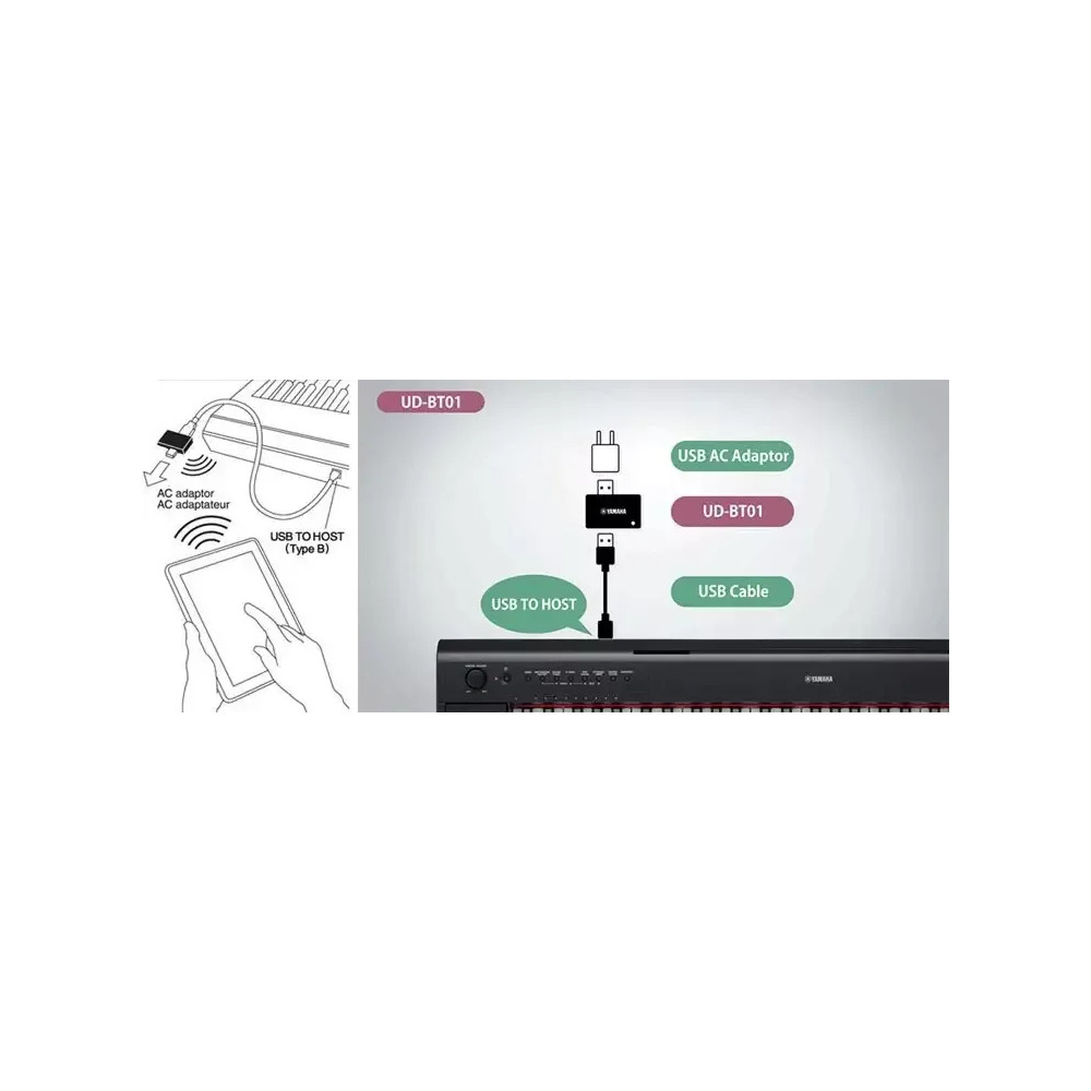 Jednoduché a snadné bezdrátové připojení nástrojů vybavených portem USB TO HOST k iOS zařízením nebo počítači Mac. Získáte tak možnost bezdrátově používat širokou škálu hudebních aplikací pro ještě větší vystoupení a komponování. Snadné připojení! Používejte hudební aplikace bezdrátově! Bezdrátově připojte vaše iOS zařízení (iPhone/iPad/iPod touch) k vašemu nástroji pomocí Bluetooth a zbavte se tak neustálého propojování vždy, když si chcete zahrát. Používejte hudební aplikace bez kabelů a užijte si volnost, kterou bezdrátová technologie přináší vašim vystoupením. Jak se připojit 1. Zapojte přiložený USB kabel do portu USB TO HOST na nástroji a připojte UD-BT01.*2. Spusťte kompatibilní aplikaci na vašem iOS zařízení. 3. V aplikaci aktivujte MIDI Bluetooth. *Musíte také k UD-BT01 připojit USB AC adaptér z důvodu napájení. Užijte si hru na vaše hudební nástroje s širokou škálou hudebních aplikací Hudební aplikace Yamaha nabízejí širokou paletu způsobů, jak obohatit vaše hudební vystoupení · Aplikace Controller umožňují nastavit jedním dotykem například interní metronom v digitálním pianu, nebo další funkce · Přizpůsobíte si digitální bicí sady s využitím intuitivního rozhraní aplikace · Pomocí aplikací fungujících jako tónové generátory získáte přístup k široké škále zvuků, které nejsou dostupné ve vašem nástroji · Můžete si snadno nahrát své denní cvičení a pak je zpětně přehrávat pro analyzování obtížných pasáží · Můžete využívat vizuální efekty, které dodají grafickou dynamiku vašim živým vystoupením Kompatibilní aplikace naleznete zde Více podrobných informací o kompatibilních aplikacích a nástrojích naleznete zde Připojte se bezdrátově a nabíjejte své iOS zařízení během používání Bezdrátové MIDI připojení znamená, že se nemusíte obávat obsazení konektoru na vašem iOS zařízení. Bez problémů můžete nabíjet vaše iOS zařízení (iPhone/iPad/iPod touch) při používání aplikací a nemusíte mít strach, že se vám během produkce vybije baterie. Připravil PJ