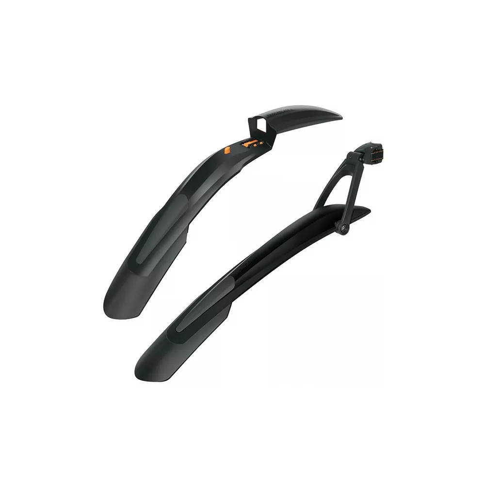 Sada blatníků SKS Shockblade a X-Blade pro 29 palcová a plusková 27,5 MTB kola v decentním černém barevném provedení. Rychloupínací montážní systém usnadňuje montáž blatníků do přední vidlice a na sedlovkou trubku. Součástí dodávky je pět kónických adaptérů mezi 15 a 35 mm do sloupku přední vidlice.