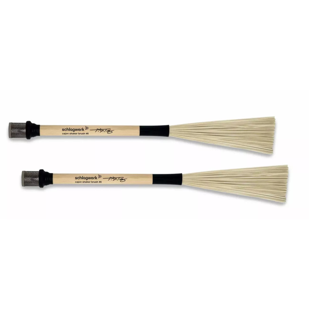 Schlagwerk BRC 06 Cajon Brush-Shaker Brush jsou metličky, které vznikly ve spolupráci s americkým perkusistou T.J.Troyem. Metličky s rukojetí 15,8 mm jsou extrémně pohodlné a dobře vyvážené v ruce. Nylonové štětiny produkují na cajonu teplý a bohatý zvuk. Největším vylepšením jsou však šejkrové kapsle připevněné ke konci rukovětí. Hraním s těmito matličkami vytvoříte pěkný zvuk shakeru, který doplní váš groove. Alternativně lze metličky použít jako běžný shaker nebo jej dokonce kombinovat s technikami paliček při hře ve vzduchu, což vede k nekonečným možnostem. Specifikace Materiál vláken: nylon, medium hard Držák: dřevěný Special: kovoý shaker na konci rukověti Pogumovaná ochrana na konci rukověti Délka: 400 mm Průměr: 15,8 mm Připravil PJ