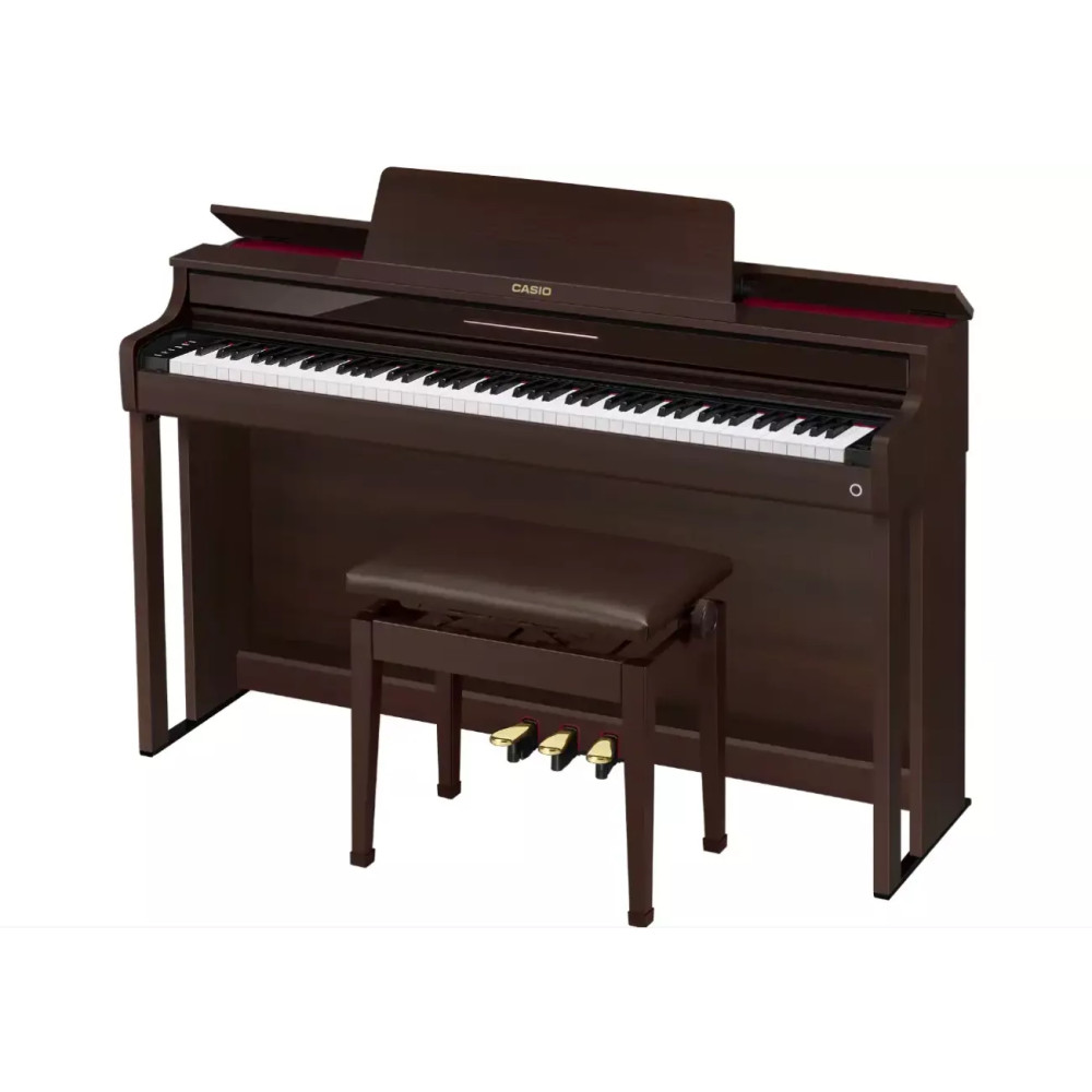 Casio AP-550 BN je nové digitální piano ze série Celviano. Ponořte se do časově neomezené krásy klasické klavírní hudby ve vašem vlastním unikátním stylu s Casio AP-550. Nabízí výjimečné hudební schopnosti, která překračují očekávání. Ponořte se do vznešeného a jemného umění koncertního klavíru propojeného s moderní technologií. Zažijte expresivní sílu a radost z technik hry, které jsou jedinečné pro koncertní klavíry, a zároveň si užijte jejich bohaté dědictví. Zvuková Technologie Využijte zářivost a výrazovou sílu, která je vlastní koncertnímu klavíru, s naší pokročilou zvukovou technologií. Přizpůsobte svůj výkon pomocí všestranných a expresivních tónů koncertního klavíru šitých na míru vašim oblíbeným písním, žánrům a hudebním stylům. Vynikající hratelnost Užijte si vynikající hratelnost s naší klávesnicí, která spojuje mechaniku kladívkového akce s digitální technologií. Prozkoumejte jemné práce s pedálem s naším pečlivě navrženým třípedálovým systémem, který zachycuje jemné nuance hry koncertního klavíru bez námahy. Výjimečný zvuk Prožijte přirozené rezonance koncertního klavíru s naším 2kanálovým 4reproduktorovým zvukovým systémem. Přizpůsobte si svůj klavírní zážitek různými efekty pomocí funkce "Sound Mode" a užijte si vyvážený zvuk při všech frekvencích s "Volume Sync Equalizer" i při použití nízké úrovně hlasitosti. Inovativní funkce Prozkoumejte inovativní funkce, jako je Vizuální Informační Panel pro zpětnou vazbu o úrovni síly hry, ovládání pedálů či tempu v reálném čase, či Instant RePlayer zaznamenávajícího 270 sekund vaší hry pro pohodlnou kontrolu vašeho výkonu. Využijte bezdrátového připojení s přiloženým bezdrátovým MIDI & Audio adaptérem, pro připojení k chytrému telefonu a přehrávání audio zdrojů přes váš nástroj. Specifikace Klaviatura: Smart Hybrid Hammer Action Keyboard CELVIANO Edition Materiál kláves: kompozit dřeva a pryskyřice Počet kláves: 88 Citlivost úhozu: 5 úrovní citlivosti, vypnuto Generátor tónů: Vícedimenzionální morfující zvukový procesor AiR Maximální polyfonie: 256 Počet zvuků: 26 Vestavěné skladby: 60 Výuková funkce: Part Zap/ Vyp (Volba části: pravá ruka, levá ruka, obě ruce) Uživatelské skladby: 10 skladeb (max., až do přibližně 320 KB/skladba) Demo skladby: 2 Layer: ano Split: ano Duet režim: ano Transpozice: +- 12 půltónů Stupnice: 17 typů Metronom: ano Audio přehrávání: ano Nahrávání Instant RePlayer: kapacita dat: 270 sekundNahrávání MIDI záznamník: 2 stopy (1 systémová stopa + 1 sólová stopa), 1 skladbaAudio rekordér: na USB paměť, max. 99 skladeb, přibližně 25 min/skladba Pedály: 3, damper (kontinuální, fce half-damp), soft (2 úrovně), sostenuto USB: ano (A a B) MIDI: přes USB B nebo bezdrátový MIDI & Audio adaptér Sluchátkový výstup: 2x Reproduktory: 12 cm x 2 + 3,5 cm x 2 Výkon: 20 W+20 W (max) Napájení: adaptér AD-E24250LW Příkon: 20 W Rozměry: 1 401 x 440 x 891 mm (bez notového stojanu) Hmotnost: 49,5 kg Barva: hnědá Dodané příslušenství: Bezdrátový MIDI & AUDIO adaptér (WU-BT10), notový stojan, AC adaptér (AD-E24250LW), výškově stavitelná stolička, držák na sluchátka, návod