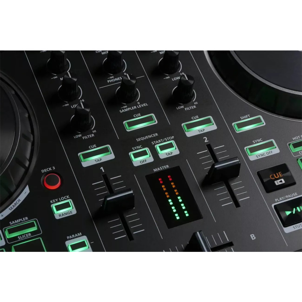 Roland DJ-202 je kompaktní DJ kontrolér s podporou Serato, zabudovanou zvukovou kartou a zvuky z legendárních bicích mašin TR-808 a TR-909. K dispozici jsou dva kanály a možnost ovládat až čtyři decky a široké jog disky přímo vybízí ke scratchování. Funkce Serata jako Hot Cue, Loop, Sequncer a Sampler lze ovládat pomocí příslušných padů. Kontrolér obsahuje bicí zvuky TR-808 a TR-909, při budoucí aktualizaci firmwaru bude doplněn také o TR-606 a TR-707. Vše bylo vytvořeno pomocí technologie Analog Circuit Behavior, takže je nerozeznáte od originálu. Zabudovaný sekvencér ovládá Serato DJ sampler, rychle tak vytvoříte potřebný beat. Mobilní DJs ocení také napájení přes USB. Typ: DJ kontrolér Software: Serato DJ Intro Vstupy: 1x Jack 6,3 mm TS (mic) Výstupy: 2x RCA, Midi Out USB: Ano Integrovaná zvuková karta: True Barva: Černá Obsah balení: Kontrolér, USB kabel Šířka: 478 mm Hloubka: 297 mm Výška: 62 mm Hmotnost: 2,1 kg