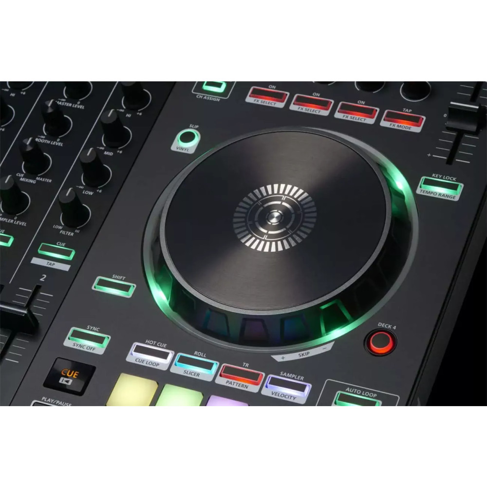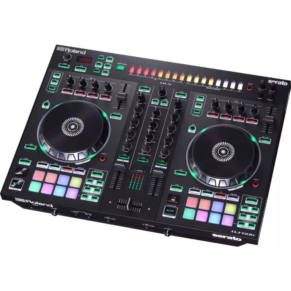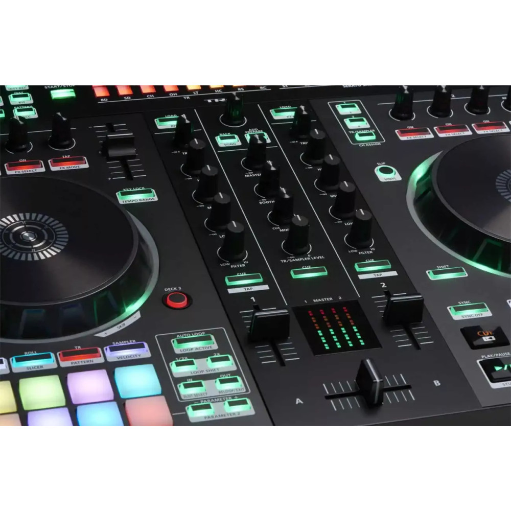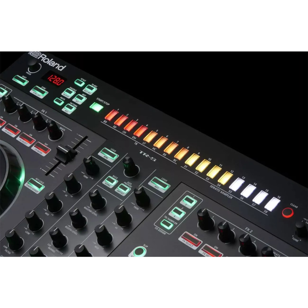 Roland DJ-505 je moderní DJ kontrolér s podporou Serato, zabudovanou zvukovou kartou, sekvencérem a zvuky z legendárních bicích mašin TR-808 a TR-909. K dispozici jsou dva kanály a možnost ovládat až čtyři decky a široké jog disky přímo vybízí ke scratchování. Funkce Serata jako Hot Cue, Roll, Slicer, TR, Pattern a Sampler lze ovládat pomocí příslušných padů. Kontrolér obsahuje bicí zvuky TR-808 a TR-909, při budoucí aktualizaci firmwaru bude doplněn také o TR-606 a TR-707. Vše bylo vytvořeno pomocí technologie Analog Circuit Behavior, takže je nerozeznáte od originálu. U zvuků bicích a Serato sampů jsou k dispozici ovladače Level, Attack, Decay a Tune pro live tweakování a nechybí ani sekvencér se šestnácti kroky. Na kontroléru najdete konektory pro připojení k PA, Booth výstup, dvojici sluchátkových výstupů a mikrofonní vstup s Gate, filtrem, reverbem a echo efektem. Nechybí ani MIDI out, mix funguje také jako stand-alone a je Serato DVS upgrade ready. Typ: DJ kontrolér Software: Serato DJ, Serato Tool Kit licence Vstupy: 4x RCA (Phono/Line), 1x Jack 6,3 mm TS (mic) Výstupy: 2x XLR, 2x RCA, 2x Jack 6,3 mm TS (booth), 1x Headphone Jack 6,3 mm TRS, 1x Headphone Jack 3,5 mm TRS USB: Ano Integrovaná zvuková karta: True Barva: Černá Obsah balení: Kontrolér, adaptér, USB kabel Šířka: 530 mm Hloubka: 402 mm Výška: 73 mm Hmotnost: 3,5 kg Adaptér součástí: Ano