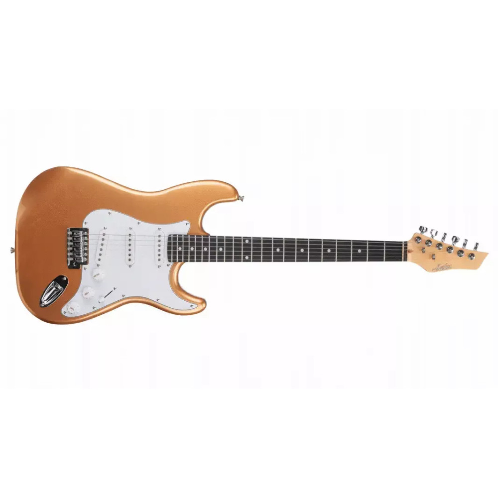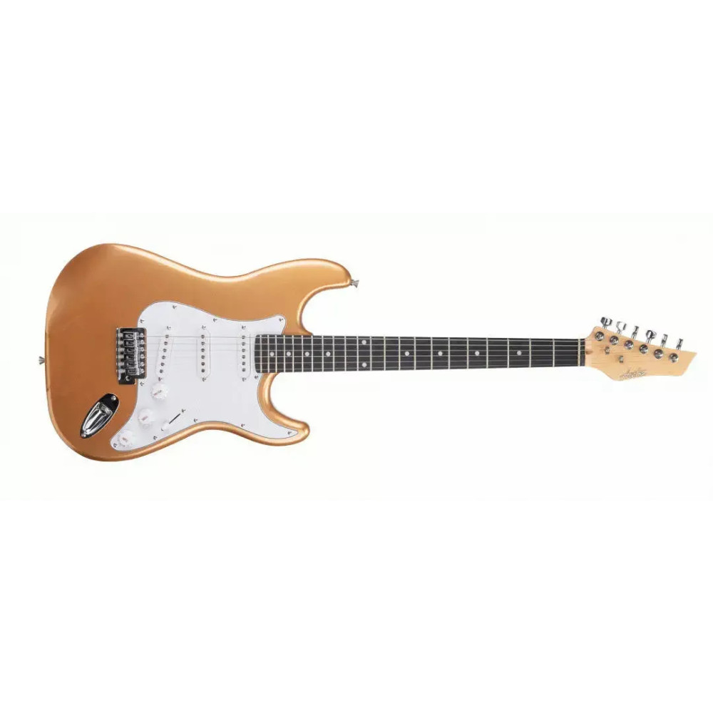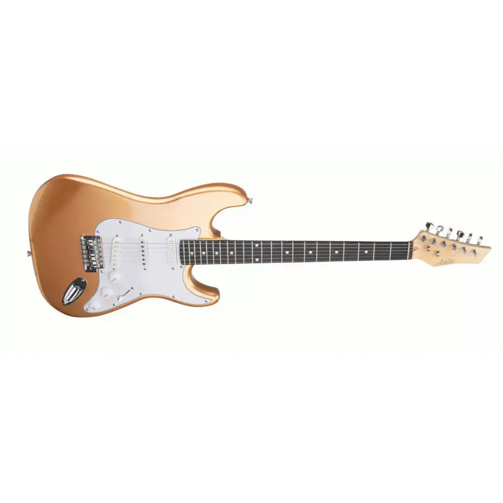 Ashton AG232 GD PackPaket elektrické kytary, povlaku, řemenu, kabelu a online lekce hry na kytaru (v anglickém jazyce). Ashton AG 232 GD je elektrická kytara s tradičním tělem ve stylu Stratocasteru se třemi jedno cívkovými snímači Single Coil. Výborný nástroj pro začátečníky. Tělo kytary je z topolu, krk z javoru a hmatník ze SmartWoodu. Kytara je osazena 22 pražci, menzura je 25,5“. Pro nastavení zvuku můžete využít potenciometr hlasitosti Volume, 2x tónovou clonu Tone a 5 polohový přepínač. Barevné provedení: GD (Metallic Gold). Specifikace Ashton AG232 GD Pack Paket obsahuje: elektrickou kytaru AG232 GD, povlak ARM 200G, řemen, kabel a online lekci Model elektrické kytary: Ashton AG232 GD Tvar těla: ST (Stratocaster) Tělo: Topol Krk: Javor Hmatník: SmartWood Počet pražců: 22 Mensura: 25,5" Hardware: chrom Snímače: S/S/S – 3x Single Coil Ovladače: 5 polohový přepínač snímačů, hlasitost, 2x tónová clona Pickguard: bílý Barva: GD (Metallic Gold) Připravil JH
