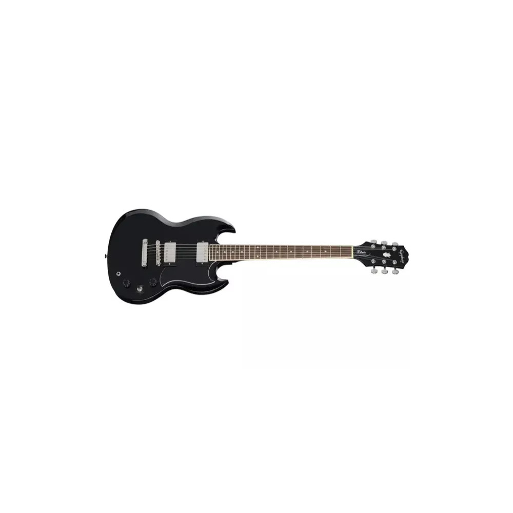Epiphone SG Tribute Ebony Elektrická kytara inspirovaná legendárním Gibson SG, která nabízí typický vzhled, plný zvuk a spolehlivou konstrukci za dostupnou cenu. Díky jednoduchému designu bez zbytečných ozdob se nástroj soustředí na to nejdůležitější – pohodlnou hru a skvělý tón.Mahagonové tělo a krk s profilem Rounded C poskytují teplý a vyrovnaný zvuk, který doplňuje hmatník z fíkovníku s 22 Medium Jumbo pražci. Dvojice keramických humbuckerů Epiphone 650R a 700T nabízí hutný, energický tón vhodný pro rock, blues i tvrdší žánry. Ovládání je řešeno jednoduše pomocí jednoho potenciometru hlasitosti, tónové clony a třípolohového přepínače. Stabilní ladění podporují Epiphone Die-Cast mechaniky a pevná kobylka LockTone TOM se struníkem.