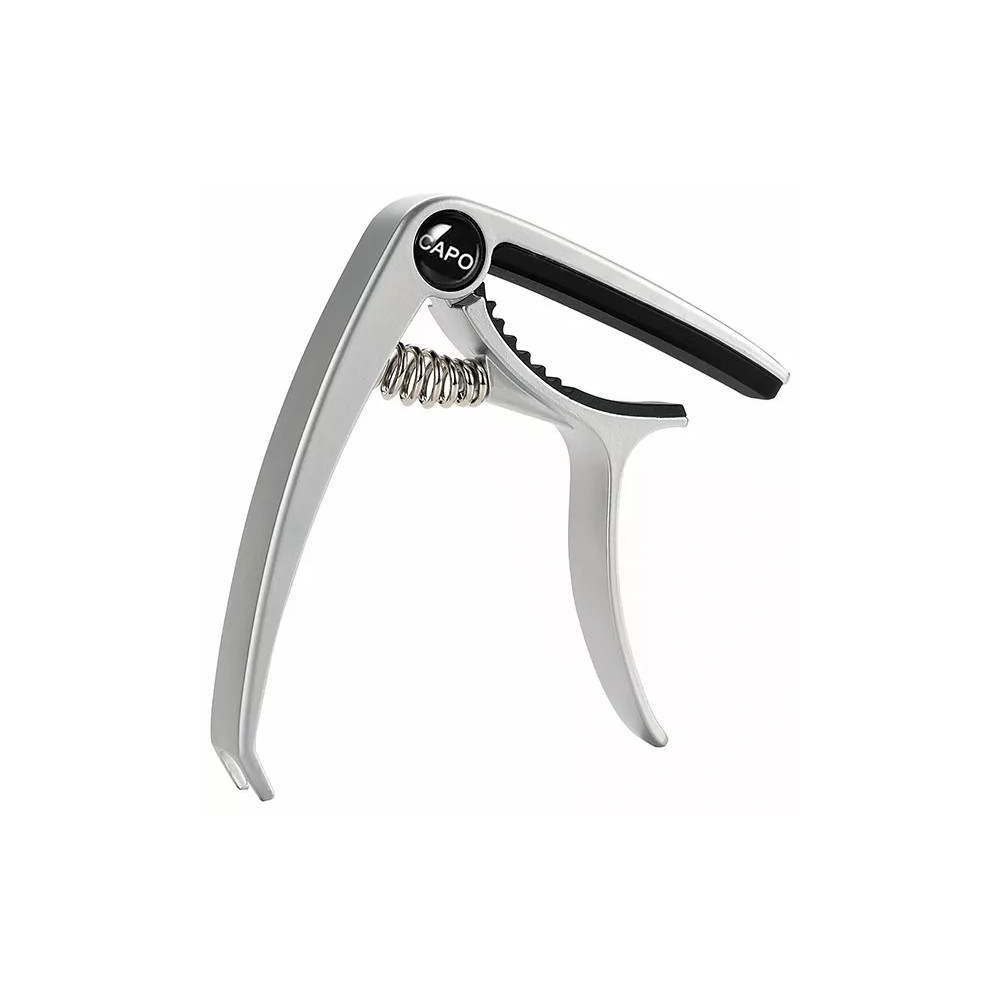 Fzone FC-76 Silver je univerzální pákový kapodastr ve stříbrném designu s vysouvačem kolíčků kobylky na jednom konci. Je vhodný pro akustické, elektroakustické (westernové, folkové, dreadnought, jumbo), elektrické i klasické kytary. Lze jej použít jak pro 6 tak i 12strunné modely. Je vyroben z kovu a je vybaven ocelovou pružinou. Perfektní kontakt s hmatníkem zajišťuje silikonový proužek. Barevné provedení je stříbrné.
