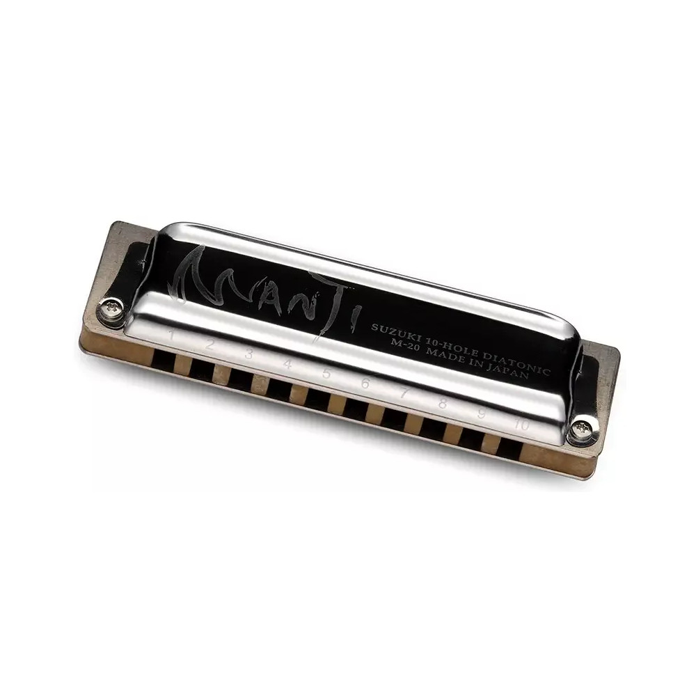 Diatonická foukací harmonika Suzuki Manji M-20 s výjimečně silným a čistý zvukem a snadným ohýbáním tónů. Vyznačuje se vynikající kvalitou a provedením. Revoluční je její kompozitový hřeben, který simuluje zvukové vlastnosti dřeva ale netrpí vlhkostí. Tento model je pojmenován po zakladateli značky Suzuki. Pan Manji Suzuki, kterému je již přes 80 let, se stále naplno věnuje své firmě, výrobě a vývoji harmonik. To, že propůjčil tomuto modelu své jméno značí, že si plně stojí za jeho vývojem a je spokojen s výsledkem. Tento model nabízí silný, hutný tón díky speciálnímu, kompozitovému hřebenu, dynamičtější tón chopný si poradit i se silnější hrou a rezonující, otevřený celkový zvuk. Skvělá odezva této harmoniky, umožňuje nástroji reagovat i na nejjemnější nuance v dechu hráče. Ladění K dispozici je široká paleta různých ladění: C, G, A, D, E, F, Bb, B, F#, Eb, Ab, Db, Hi G a Low F. Ladění nástroje je prováděno pomocí počítačem řízených laserů. Kryt těla Harmonika je vyrobena s ocelovým krytem v klasickém designu custom nástrojů. Na přání bluesových a rockových hráčů na harmoniky je zadní strana nástroje zcela otevřená a umožňuje skvělou projekci zvuku. Velké otvory na bocích nástroje umožňují hráči přímo dobře slyšet svůj nástroj. Suzuki je první výrobce harmonik, který přesunul jedinný upevňovací šroub na předek hřebenu, kde zajistí maximální tlak a tím i vzduchotěsnost nástroje. Hřeben Nástroj je vybaven revolučním kompozitovým hřebebem simulujícím vlastnosti dřeva, který však není negativně ovlivňován vlhkostí. Nabízí tak zvuk velmi podobný nástrojům s dřevěným hřebebem, ale bez obtíží spojených s vlhkostí. Výsledný zvuk je také silnější než u jiných nástrojů s plastovým hřebenem. Jazýčky a plátky Firma Suzuki si získala celosvětové uznání za přesnost a odolnost svých jazýčků. Jazýčky a plátky této harmoniky jsou fosforbronzové. Díky nově vyvinuté technologii upevnění jazýčků na plátky je dosaženo nejjemnější rozestupu mezi jazýčkem a jeho slotem mezi světovými výrobci. Precizně vyvinuté profily a délky jazýčků se také podílejí na silnějším a plnějším zvuku s možností snadného ohýbání tónů a s delší životností. Náhradní plátky lze v našem eshopu dokoupit samostatně pod označením RP-M-20 Manji v mnoha různých laděních. Příslušenství Součástí nástroje je kvalitní a odolné, polstrované plastové pouzdro, návod na péči o nástroj a tabulka tónů. Harmoniky Suzuki Manji lze zakoupit také ve dvou setech, v durových Low laděních a v různých mollových, country a seventh laděních. Set M-20-3SET obsahuje tři harmoniky v laděních C, G, A v luxusním pevném tvarovaném pouzdře. Set M-20-7SET obsahuje sedm harmonik v laděních C, G, A, D, E, F a Bb v parádním látkovém pouzdře 10HC-8. Hráči na Manji SuzukiBilly Branch (USA)Jason Ricci (USA)Brandon Oneal Bailey (USA)Filip Jers (Švédsko) VideoVideo recenze a semináře o harmonice Manji Suzuki najdete například zde: https://www.youtube.com/watch?v=aXbjnFtdY8o https://www.youtube.com/watch?v=QjojKRAX1jw https://www.youtube.com/watch?v=0Jv8hZXiScc&t=2s Připravil PJ