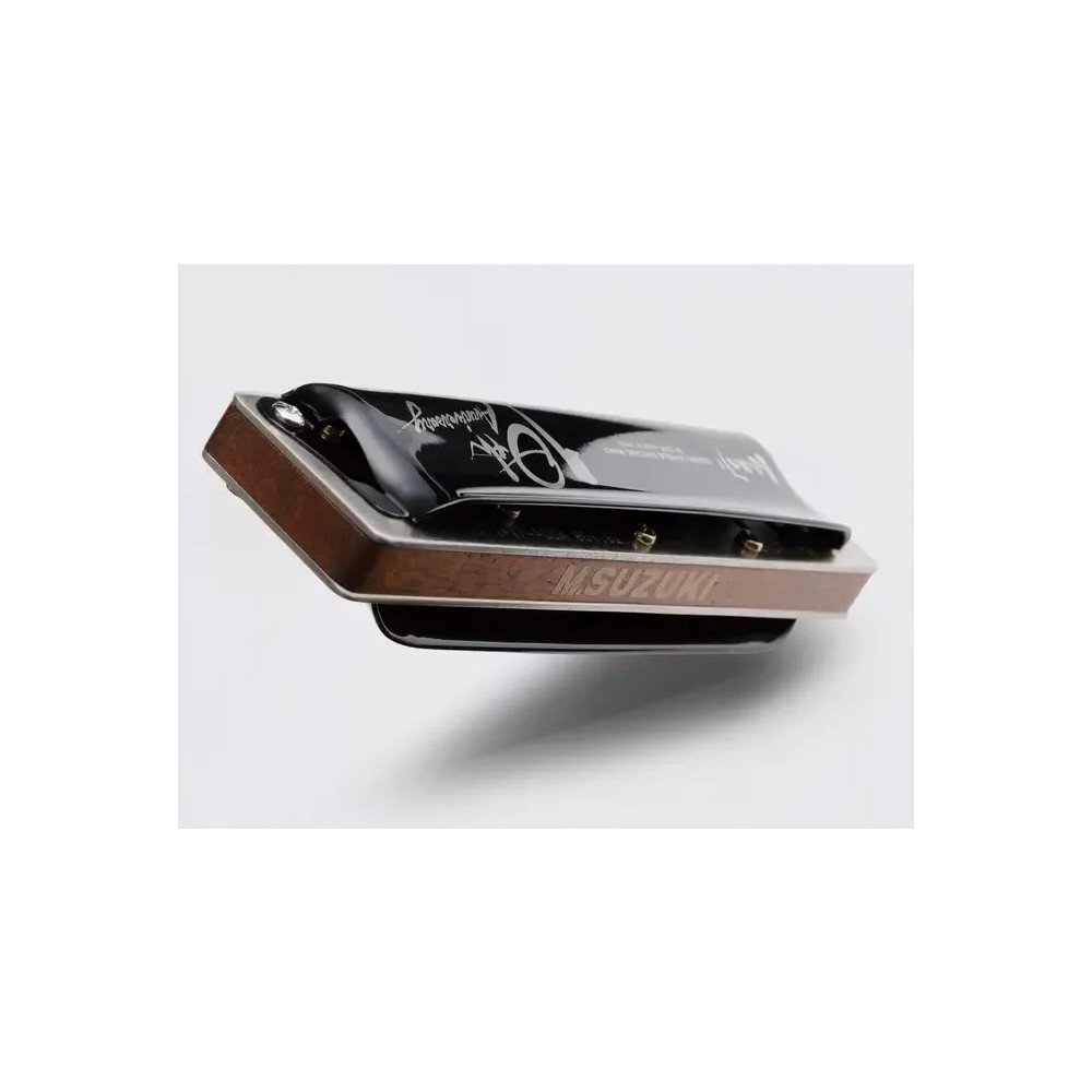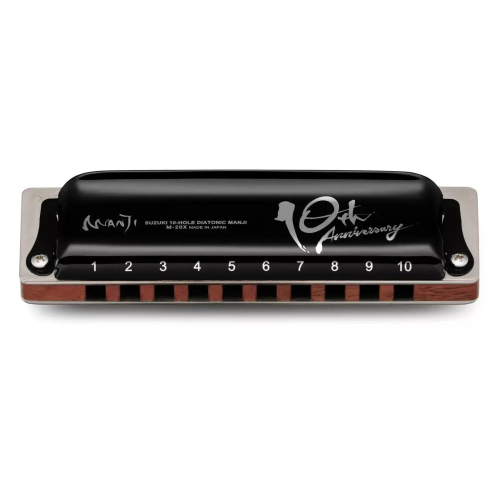 Diatonická foukací harmonika Suzuki Manji M-20X s výjimečně silným a čistý zvukem a snadným ohýbáním tónů. Vyznačuje se vynikající kvalitou a provedením. Tento model je vyroben jako oslava 10. výročí výroby modelu Manji, který byl pojmenován po zakladateli značky Suzuki. Pan Manji Suzuki, kterému je již přes 80 let, se stále naplno věnuje své firmě, výrobě a vývoji harmonik. To, že propůjčil tomuto modelu své jméno značí, že si plně stojí za jeho vývojem a je spokojen s výsledkem. Tento model nabízí silný, hutný tón díky speciálním, silným fosforbronzovým jazýčkům. Tón je dynamičtější, schopný si poradit i se silnější hrou a nabízí rezonující, otevřený celkový zvuk. Skvělá odezva této harmoniky, umožňuje nástroji reagovat i na nejjemnější nuance v dechu hráče. Ladění K dispozici je pouze v ladění: C. Ladění nástroje je prováděno pomocí počítačem řízených laserů. Kryt těla Harmonika je vyrobena s ocelovým krytem v klasickém designu custom nástrojů. Na přání bluesových a rockových hráčů na harmoniky je zadní strana nástroje zcela otevřená a umožňuje skvělou projekci zvuku. Velké otvory na bocích nástroje umožňují hráči přímo dobře slyšet svůj nástroj. Suzuki je první výrobce harmonik, který přesunul jedinný upevňovací šroub na předek hřebenu, kde zajistí maximální tlak a tím i vzduchotěsnost nástroje. Hřeben Nástroj je vybaven dřevěným hřebebem z havajského koa. Nabízí tak teplý a vřelý zvuk. Jazýčky a plátky Firma Suzuki si získala celosvětové uznání za přesnost a odolnost svých jazýčků. Jazýčky a plátky této harmoniky jsou fosforbronzové. Díky nově vyvinuté technologii upevnění jazýčků na plátky je dosaženo nejjemnější rozestupu mezi jazýčkem a jeho slotem mezi světovými výrobci. Precizně vyvinuté profily a délky jazýčků se také podílejí na silnějším a plnějším zvuku s možností snadného ohýbání tónů a s delší životností. Tento model je vyroben se speciálními 1,1 mm silnými plátky a zvuk je tak silnější, průraznější a více zaostřený. Příslušenství Součástí nástroje je kvalitní a odolné, polstrované plastové pouzdro, návod na péči o nástroj a tabulka tónů. Hráči na Manji SuzukiBilly Branch (USA)Jason Ricci (USA)Brandon Oneal Bailey (USA)Filip Jers (Švédsko) Připravil PJ