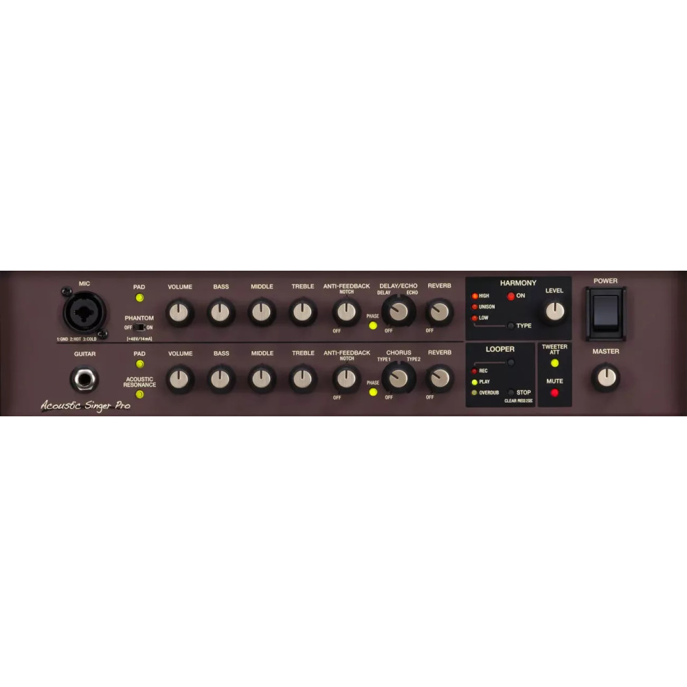 Komba ze série Acoustic Singer jsou určena především pro písničkáře s kytarou nebo jiným akustickým nástrojem, kterým zajistí vše potřebné pro kvalitní vystoupení. Oba kanály disponují třípásmovými korekcemi, ochranou proti zpětné vazbě a reverbem. Zvuk kytary můžete vylepšit dvěma typy chorusu, zpěv delayem a echem. Zabudovaný harmonizér přidá vašemu zpěvu jednu oktávu výš nebo níž, případně váš hlas zdvojí. Aby toho nebylo málo, kombo je vybaveno zabudovaným looperem s možností ovládání přes footswitch a USB rozhraním pro nahrávání do počítače. Dva XLR konektory na zadním panelu umožňují výstup každého kanálu zvlášť (před nebo po efektech) případně celého mixu. Parametry ACS-PRO: Výkon: 120 W Repro: 6,5" Počet kanálů: 2 Počet vstupů: 2 Ovládání: Master Volume, 2x Volume, 2x Bass, 2x Middle, 2x Treble, 2x Anti-Feedback Notch, Delay/Echo, Chorus, 2x Reverb Typ reproduktoru: Výrobce neuvádí Reverb: Ano Efektový procesor: Ano Typ efektů: Delay/Echo, Chorus Vstup pro mikrofon: Ano Efektová smyčka: Ne MP3/linkový vstup: Ano Provoz na baterie: Ne Vstup pro footswitch: Ano