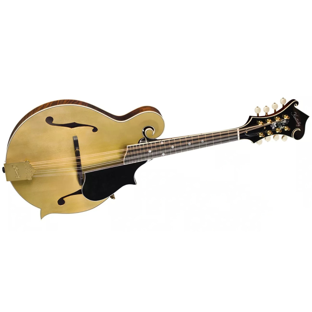 Kentucky KM-858 je celomasivní ručně vyráběná mandolína určená pro pokročilé hráče ze série Deluxe. Horní deska je z výběrového masivního německého smrku, zatímco luby a záď jsou z masivního žíhaného alpského javoru. Krk je jednodílný a je vyroben z masivního žíhaného javoru s napojením dovetail, které zajistí nejen tradiční vzhled nástroje, ale také skvělou hratelnost. Špičkový vzhled je doplněn kvalitním vysokým lakem v provedení Gold Top - zlatá. Nástroj je dodáván včetně luxusního, silně polstrovaného polotvrdého povlaku s kapsou a možností nosit nástroj na zádech. Výběr dřevaPro luby, záď a krk je použit masivní žíhaný alpský javor, zatímco vrchní deska je vyrobena z masivního vybraného německého smrku sitka. Tato kombinace materiálů je zvolena pro jejich skvělé tonální vlastnosti, a také pro jejich úžasný vzhled. Javor dodává jiskřivý a zaměřený atak, zatímoc smrková horníd eska zajistí dostatečnou hlasitost a průraznost zvuku. KonstrukceKaždý detail konstrukce nástroje vyjadřuje jemnou, uměleckou práci s využitím léty prověřených technik. Od dovetail spoje krku, přes pečlivě ručně zaoblené tělo až po precizní vykládání - vše je perfektní. Hmatník a hardwareHmatník je vyroben z vybraného ebenu pro skvěou hratelnost nástroje. Pražce jsou medium a jsou naprosto přesně umístěny a zabroušeny. Kompenzovaná a nastavitelná kobylka jsou perfektně tvarovány pro okamžitou úpravu nastavení, abyste dosáhli požadované intonace. Ladící mechanika Deluxe Gotoh je pozlacená a nabízí plynulý chod a přesnost ladění po dlouhou dobu. PovlakNástroj je dodáván včetně luxusního, silně polstrovaného polotvrdého povlaku s kapsou a možností nosit nástroj na zádech. Polstrování je silné 30 mm. K dispozici je přední kapsa na příslušenství. Nástroj je možné nosit v ruce díky masivnímu uchu nebo také na zádech díky silným, pohodně polstrovaným popruhům. Použity jsou jsou silné, kovové zipy. Specifikace Kentucky KM-858 Tvar těla: F Horní deska: výběrový masivní německý smrk sitka Luby: masivní žíhaný alpský javor Zadní deska: masivní žíhaný alpský javor Krk: masivní žíhaný alpský javor Hmatník: výběrový eben, radius Spoj krku: dovetail Výztuha krku: nastavitelná Kobylka: výběrový eben, nastavitelná Počet pražců: 22/15 Šířka nultého pražce: 28,5 mm Materiál nultého pražce: kost Menzura: 354 mm Rádius: ano Ozvučný otvor: tradiční F Pickguard: 3vrstvý, černobílý Struník: 1920 styl, mosaz Ladící mechaniky: Deluxe Gotoh, pozlacené, béžové kolíky Struny: D´Addario EJ74 Barva: Gold Top Povlak: BV-2012, polotvrdý Připravil PJ