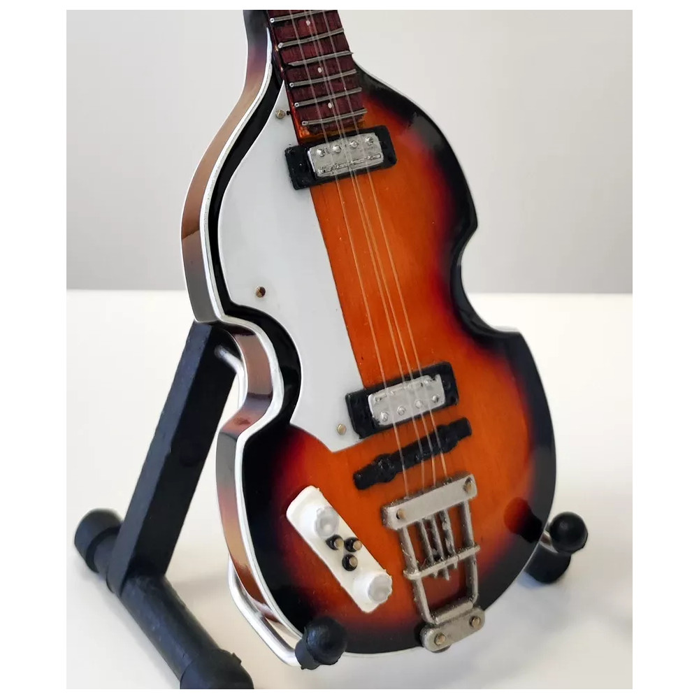 Exkluzivní miniatura elektrické baskytary, vyrobená ze dřeva se všemi detaily nástroje. Krásné ruční detailní zpracování. Délka kytary cca 25 cm, šířka 7 - 9 cm. Včetně stojánku. V dárkové krabičce. Skvělý dárek na ozdobu pokoje nebo pracovního stolu pro zapáleného kytaristu. Model Paul McCartney The Beatles Höfner Bass.