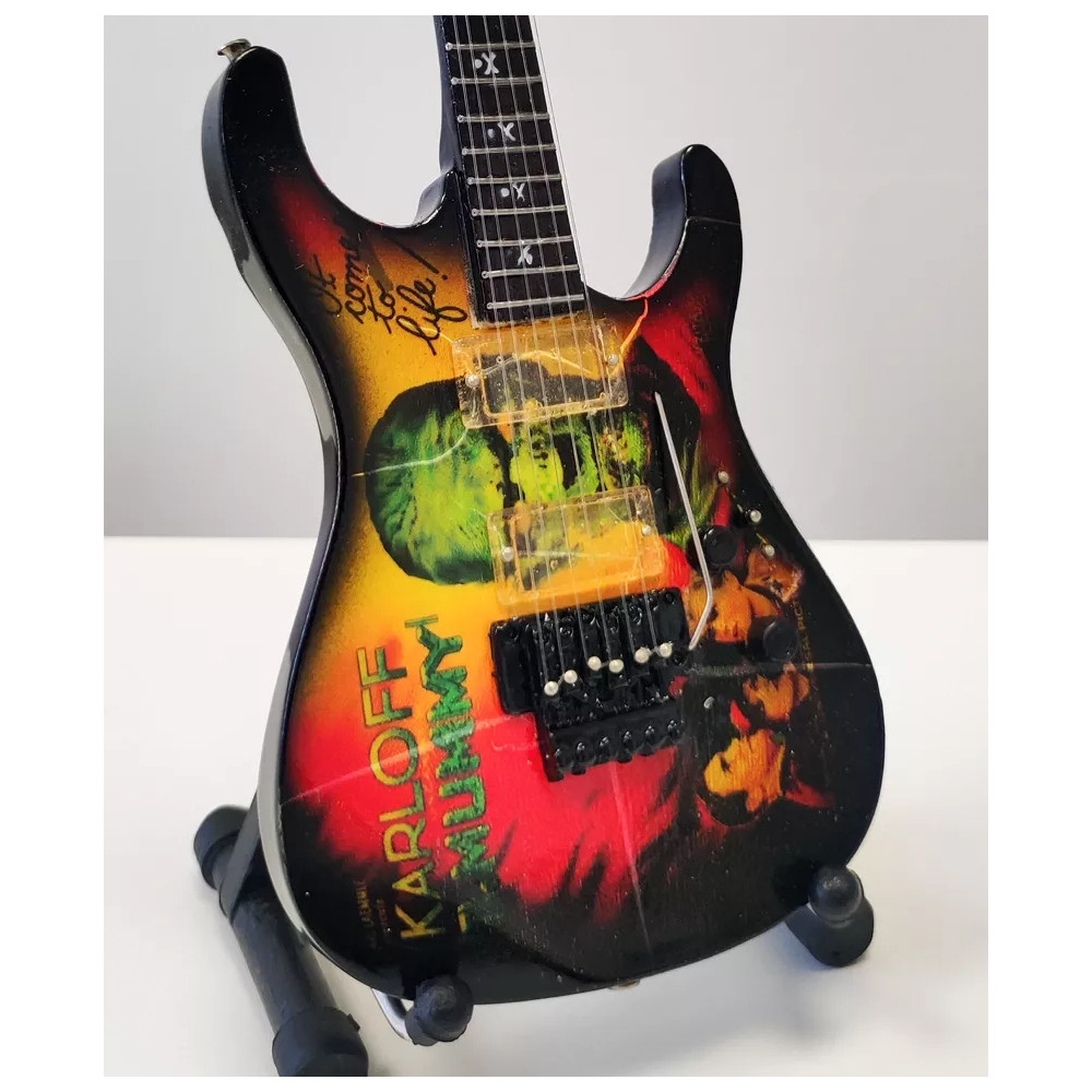 Exkluzivní miniatura kytary, vyrobená ze dřeva se všemi detaily nástroje. Krásné ruční detailní zpracování. Délka kytary cca 25 cm, šířka 7 - 9 cm. Včetně stojánku. V dárkové krabičce. Skvělý dárek na ozdobu pokoje nebo pracovního stolu pro zapáleného kytaristu. Model Kirk Hammett Metallica ESP KH2 M-II The Karloff Mummy.