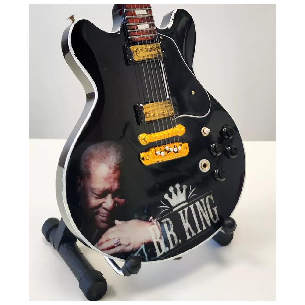 Exkluzivní miniatura kytary, vyrobená ze dřeva se všemi detaily nástroje. Krásné ruční detailní zpracování. Délka kytary cca 25 cm, šířka 7 - 9 cm. Včetně stojánku. V dárkové krabičce. Skvělý dárek na ozdobu pokoje nebo pracovního stolu pro zapáleného kytaristu. Model B.B. King Gibson ES-355 Lucille.