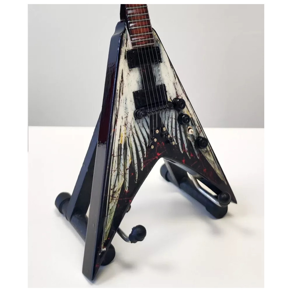 Exkluzivní miniatura kytary, vyrobená ze dřeva se všemi detaily nástroje. Krásné ruční detailní zpracování. Délka kytary cca 25 cm, šířka 7 - 9 cm. Včetně stojánku. V dárkové krabičce. Skvělý dárek na ozdobu pokoje nebo pracovního stolu pro zapáleného kytaristu. Model Dave Mustaine Megadeth Dean VMNT Angel of Deth.