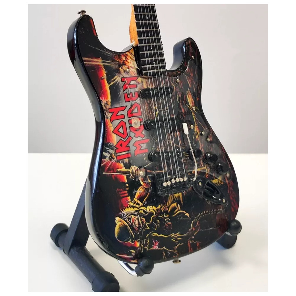Exkluzivní miniatura kytary, vyrobená ze dřeva se všemi detaily nástroje. Krásné ruční detailní zpracování. Délka kytary cca 25 cm, šířka 7 - 9 cm. Včetně stojánku. V dárkové krabičce. Skvělý dárek na ozdobu pokoje nebo pracovního stolu pro zapáleného kytaristu. Model Iron Maiden Fender Stratocaster Eddie The Trooper.