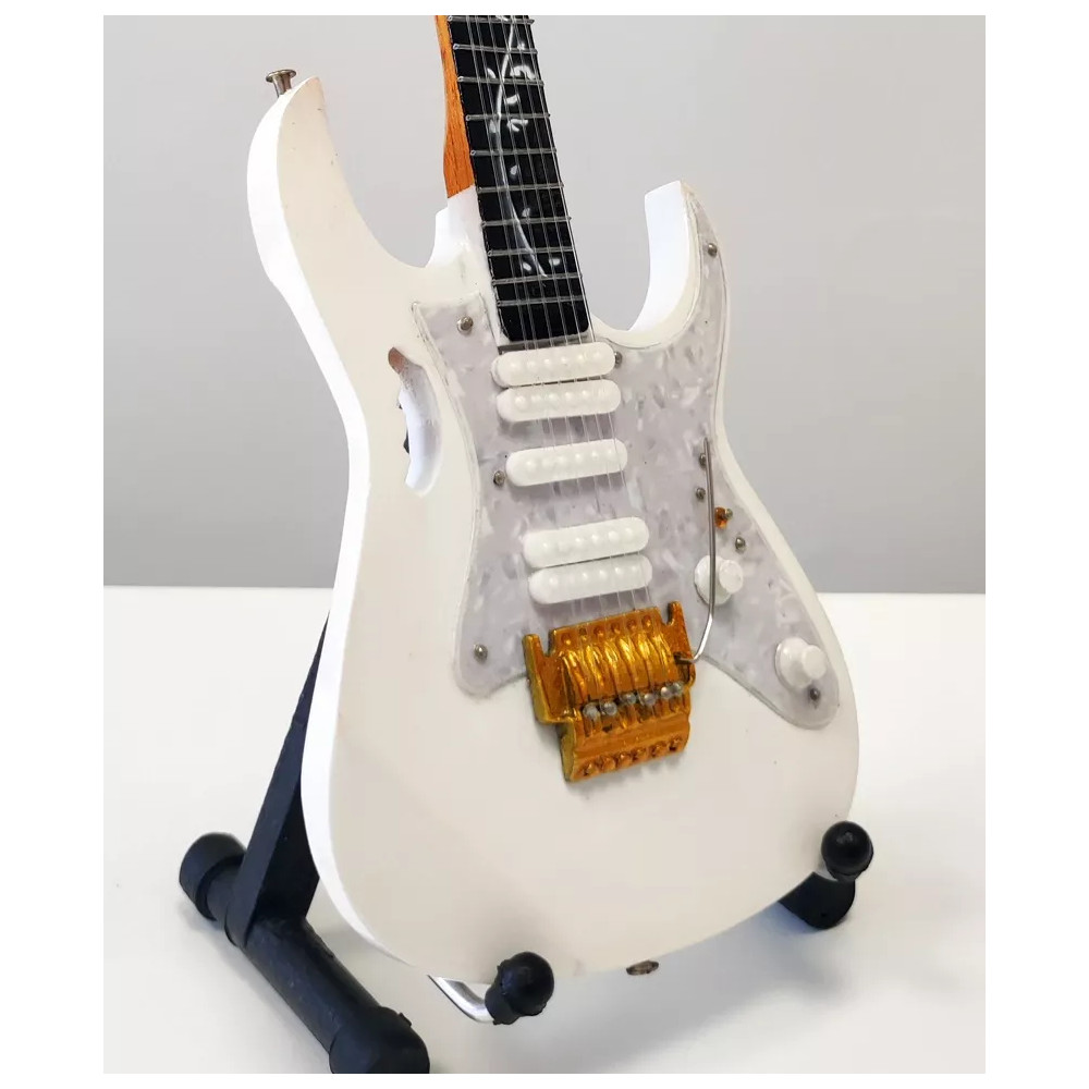 Exkluzivní miniatura kytary, vyrobená ze dřeva se všemi detaily nástroje. Krásné ruční detailní zpracování. Délka kytary cca 25 cm, šířka 7 - 9 cm. Včetně stojánku. V dárkové krabičce. Skvělý dárek na ozdobu pokoje nebo pracovního stolu pro zapáleného kytaristu. Model Steve Vai Ibanez Jem 7V Signature White.