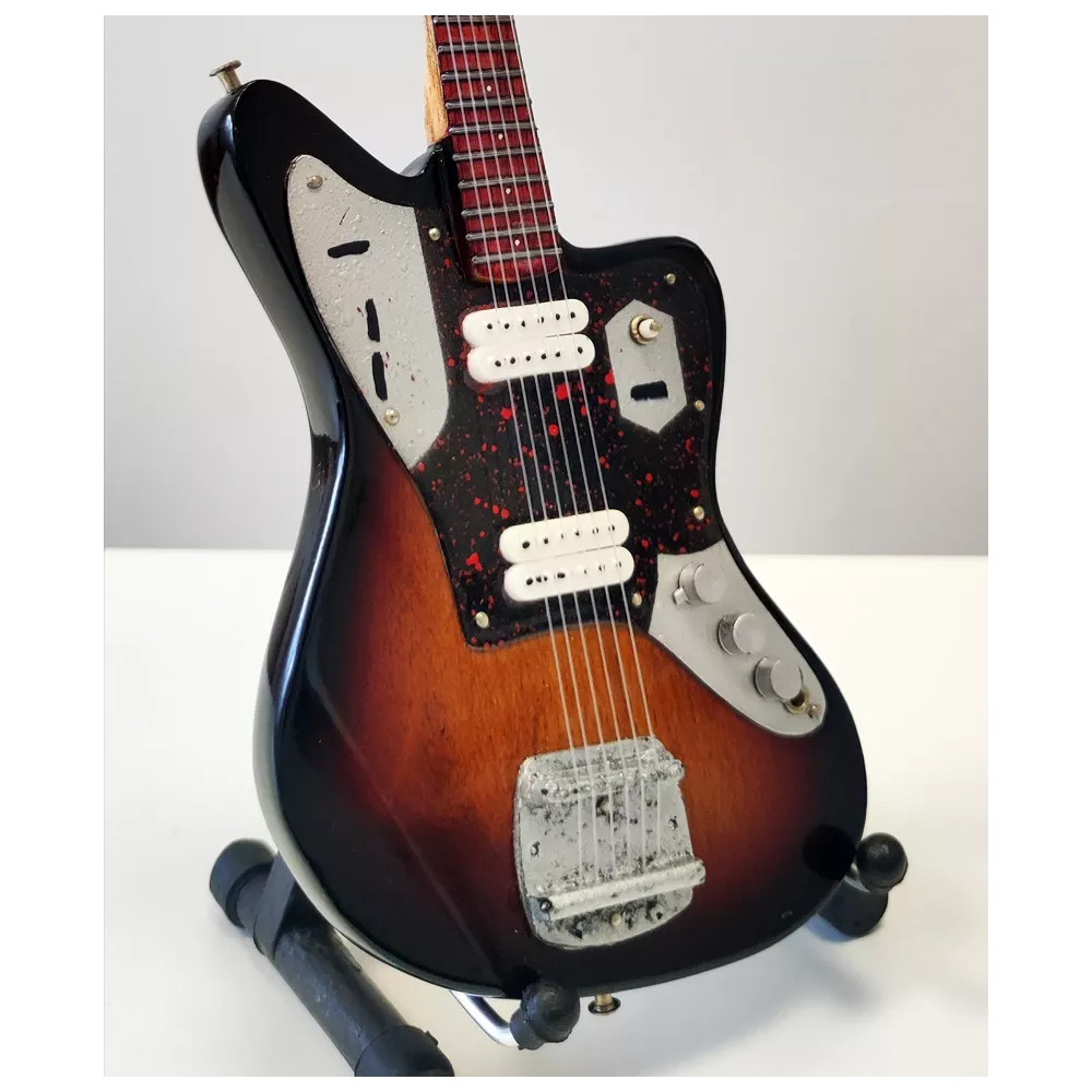 Exkluzivní miniatura kytary, vyrobená ze dřeva se všemi detaily nástroje. Krásné ruční detailní zpracování. Délka kytary cca 25 cm, šířka 7 - 9 cm. Včetně stojánku. V dárkové krabičce. Skvělý dárek na ozdobu pokoje nebo pracovního stolu pro zapáleného kytaristu. Model Kurt Cobain Nirvana Fender Jaguar 3CS.