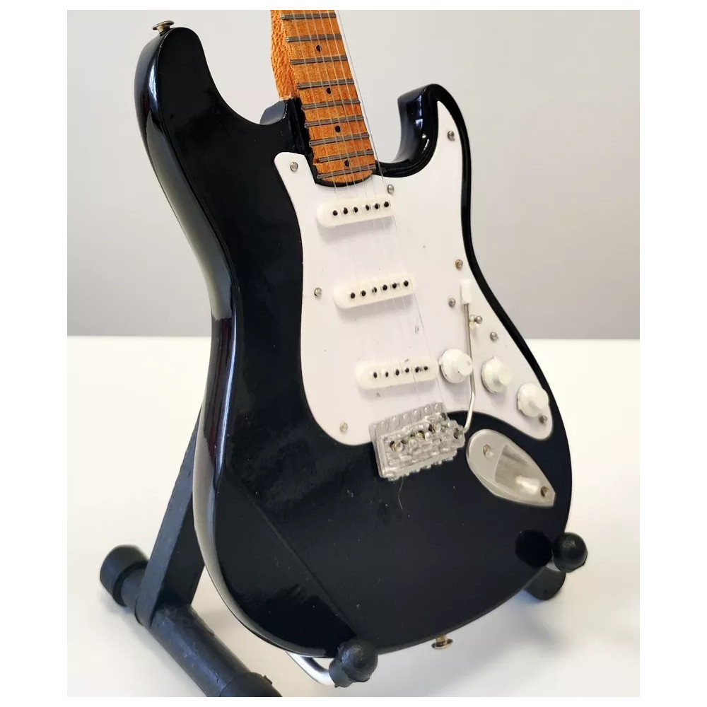 Exkluzivní miniatura elektrické kytary, vyrobená ze dřeva se všemi detaily nástroje. Krásné ruční detailní zpracování. Délka kytary cca 25 cm, šířka 7 - 9 cm. Včetně stojánku. V dárkové krabičce. Skvělý dárek na ozdobu pokoje nebo pracovního stolu pro zapáleného kytaristu. Model Eric Clapton Fender Stratocaster Blackie.