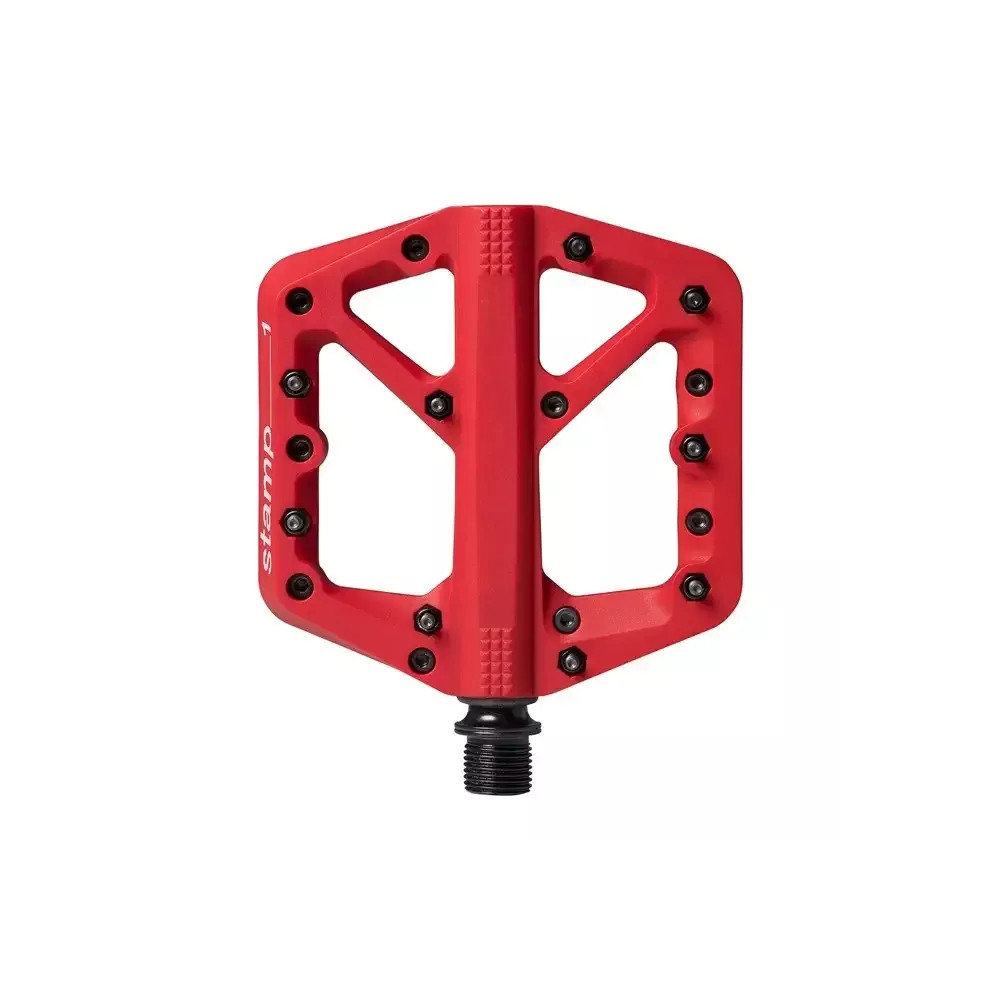 CrankBrothers Stamp jsou ploché pedály pro běžnou obuv (bez nášlapného systému). Mají hliníkové tělo, vyměnitelné ocelové piny, ocelovou osu a zapouzdřená ložiska. Barevné provedení: červená.