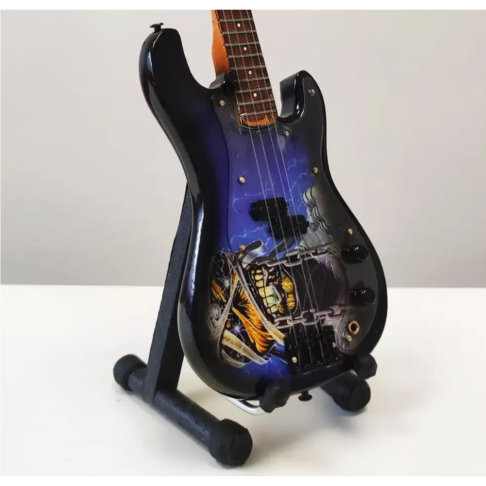 Exkluzivní miniatura elektrické baskytary, vyrobená ze dřeva se všemi detaily nástroje. Krásné ruční detailní zpracování. Délka kytary cca 25 cm, šířka 7 - 9 cm. Včetně stojánku. V dárkové krabičce. Skvělý dárek na ozdobu pokoje nebo pracovního stolu pro zapáleného kytaristu. Model Iron Maiden Powerslave Eddie Mummy Bass.