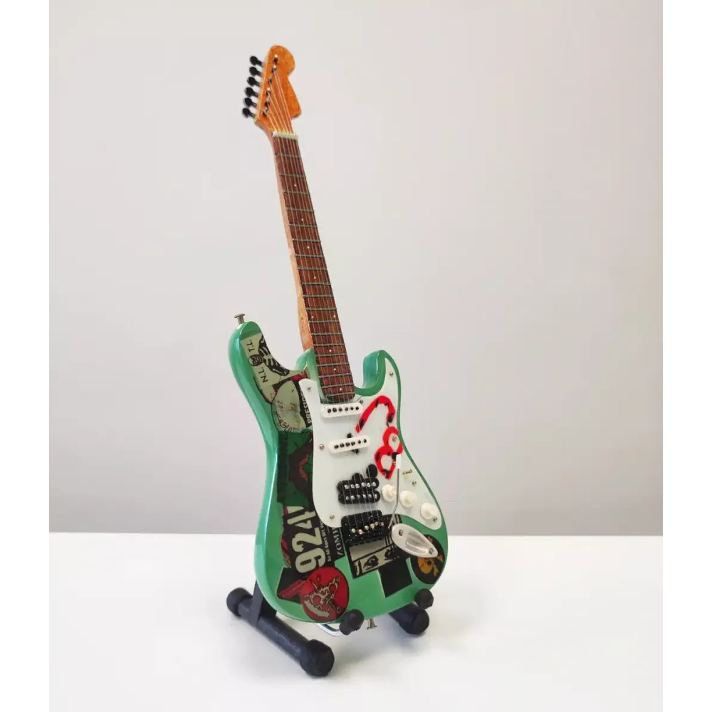 Exkluzivní miniatura kytary, vyrobená ze dřeva se všemi detaily nástroje. Krásné ruční detailní zpracování. Délka kytary cca 25 cm, šířka 7 - 9 cm. Včetně stojánku. V dárkové krabičce. Skvělý dárek na ozdobu pokoje nebo pracovního stolu pro zapáleného kytaristu. Model Billie Joe Armstrong Green Day Fernandes Stratocaster Blue.