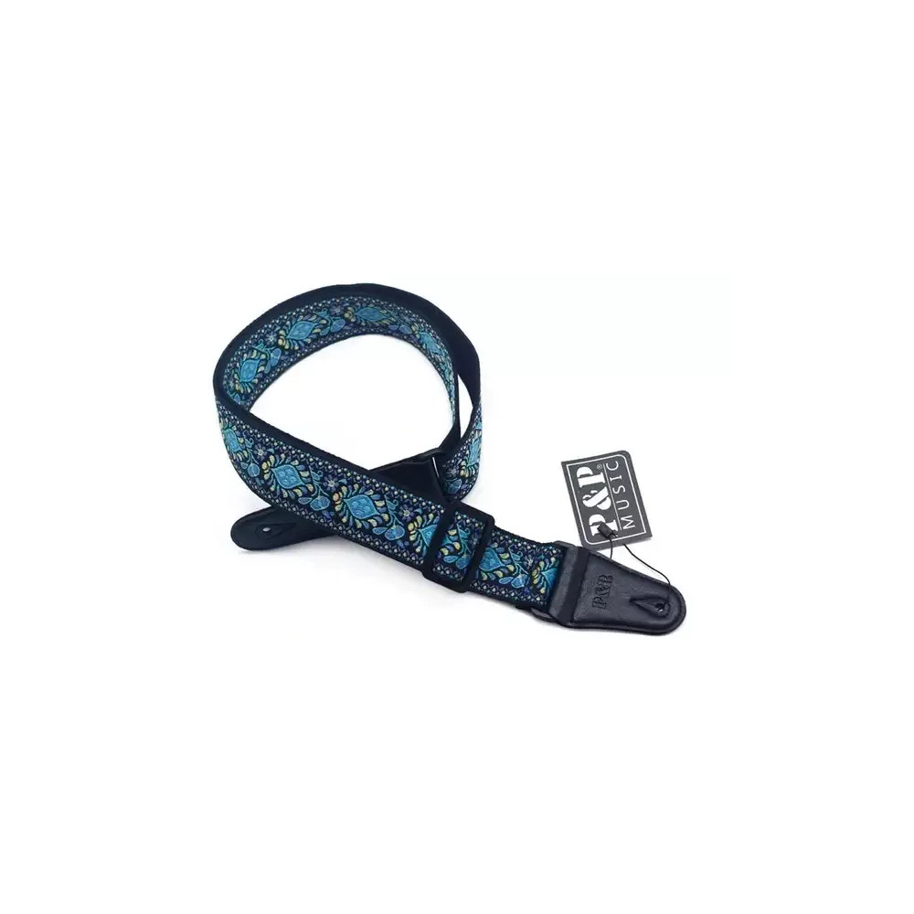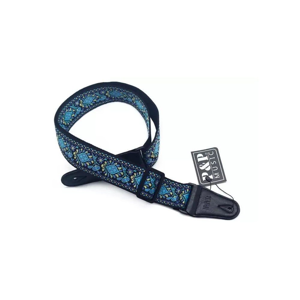 Kytarový textilní řemen P&P Music AGSP-250 DBL v tmavě modrém retro designu. Šířka řemenu je 5 cm, maximální délka řemenu je 120 cm. Materiál řemenu je bavlněná tkanina. Hmotnost je cca 200 g.