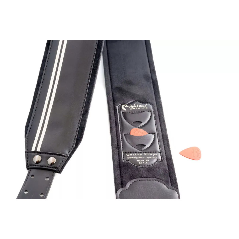 RightOn! kytarový řemen Groove B-Race Vegana Guitar & Bass Strap je perfektní, stylový ale i funkční doplněk k většině akustických a elektrických kytar inspirovaný designy závodních aut či motorek. Nabízí možnost nastavení délky v rozmezí 98 až 153 cm, je široký 8 cm, odolný a neuvěřitelně komfortní. Řemeny Groove Strap jsou vyrobeny z materiálu 'Vegana', směsi syntetických, textilních a přírodních vláken a neobsahují žádné části zvířat. Je vybaven vnitřním zásobníkem na trsátka. Výroba Španělsko. Kompletní ruční výroba. Provedení B-Race Black (černá). Všechny řemeny RightOn! se vyznačují následujícími vlastnostmi: Exkluzivní, inovativní RightOn! Adjustment Systém (RAS) s nejširším rozsahem úpravy délky řemenu na trhu. Nejlepší ramenní opora: podšívka je designována, testována a kontrolována, tak že se řemen nesmeká ani nelepí. Nejméně jeden držák na trsátko integrovaný do řemenu. Pouze ten nejkvalitnější latex pro polstrování řemenu zajistí komfort po celou dobu vystoupení. Řemeny Race Strap jsou vyrobeny z materiálu 'Vegana', směsi syntetických, textilních a přírodních vláken a neobsahují žádné části zvířat. Již od roku 2009, firma RightOn! navrhuje a vyrábí kytarové řemeny pro kytaristy a basáky - s cílem nabídnout i těm fyzicky nejvíce náročným hráčům řemeny, které vydrží nápor energie mnoha celosvětových turné. Specifikace Hlavní materiál: Vegana (bez zvířecích částí) Podšívka: mikrovlákno Polstrování: 5mm Série: Steady Kolekce: Groove Design: B-Race Vhodné pro: kytara Včetně držáku na trsátka Šířka: 80 mm Délka: 98 - 153 mm Barva: B-Race Black (černá) Ruční výroba Španelsko Připravil PJ