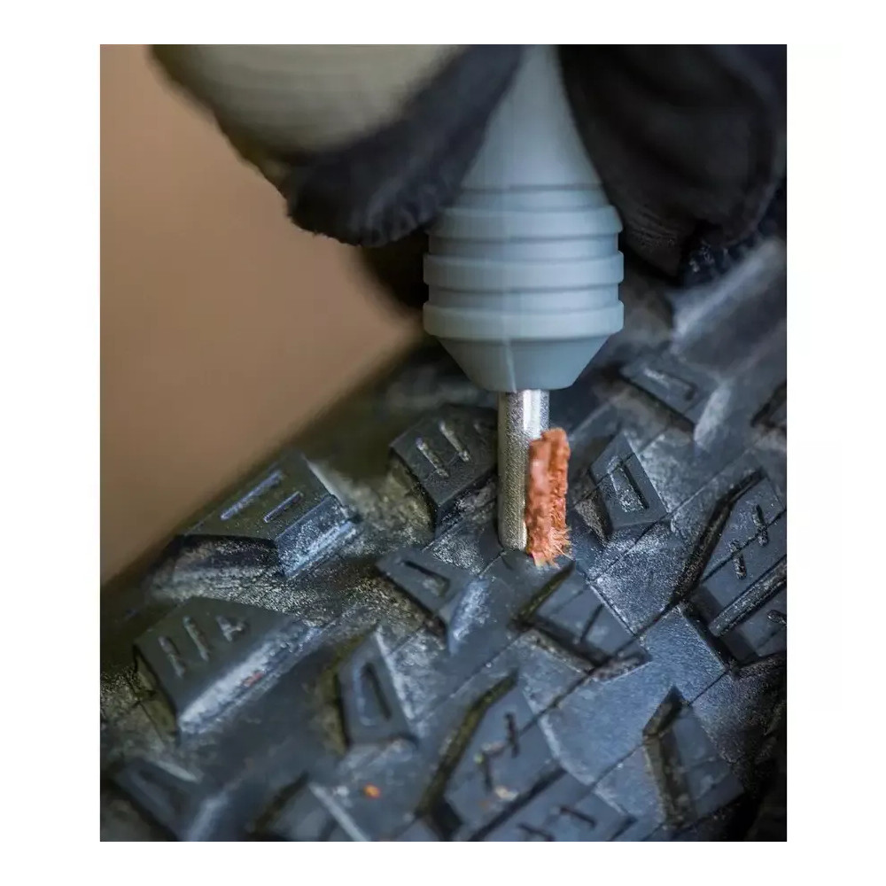 Sada na opravu bezdušových plášťů. Rukojeť nástroje pojme 10 náhradních knotů. Součástí je pásek pro přidělání na rám kola. Naprosto jednoduchá a rychlá oprava bezdušového pláště.