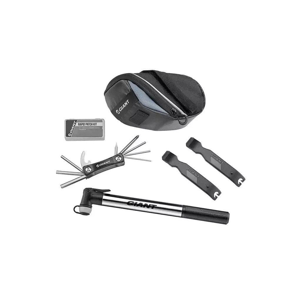 Giant Quick Fix Combo Kit with Mini Pump je sada nářadí včetně pumpičky s vlastní podsedlovou brašnou. Sada obsahuje podsedlovou brašničku Giant ST Bag (objem 0,7 litru), 9. funkční kapesní nářadí, pumpičku, 2 montpáky a sadu lepení pro opravu defektu (12 samolepících záplat a smirkový papír).
