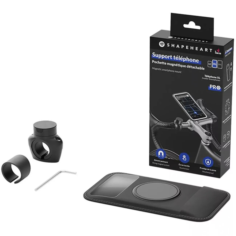 Shapeheart Bike Pro M do 14,7 cm výšky telefonu je šroubovací magnetický držák s pouzdrem na telefon pro použití na jízdním kole. Sada je dostupná ve 3 velikostech pouzdra podle velikosti telefonu (M, XL a XXL). Pouzdro na telefon je voděodolné, má průzor pro fotokameru a také vstup na sluchátka nebo USB, takže můžete telefon dokonce i za jízdy nabíjet. Samotný magnetický držák se upíná na řidítka nebo představec pomocí 2 šroubů a obejme řidítka o průměru 20-28 mm. Telefon lze snadno ovládat i v pouzdru, dotykový displej funguje i přes krycí fólii. Shapeheart Bike Pro Mount o Velikosti pouzdra M, XL a XL+ podle velikosti telefonu o Voděodolné pouzdro, vstup na sluchátka/USB pro nabíjení za jízdy o Magnetický úchyt nastavitelný v rozsahu 360° - pohled panorama nebo na výšku; uchycení držáku na řidítka silikonovým páskem o Šroubovací magnetický držák na řidítka o Dotykový displej funguje i v pouzdru o Držák kompatibilní s většinou kulatých řidítek o Pouzdro i s telefonem lze snadno odejmout od magnetického držáku na řidítkách a používat; není nutné telefon neustále z pouzdra vyndávat Sada obsahuje pouzdro na telefon, magnetický držák na řidítka, 2 silikonové podložky pro různé průměry řidítek, inbus, 2 šrouby a textilní sáček.