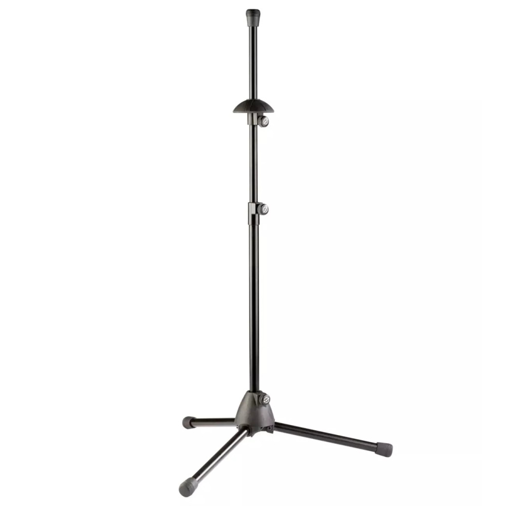 König Meyer 14985 je stojan na pozoun s plastovou základnou trojnožky vyztuženou skleněnými vlákny. Skládací nožky zajistí snadný transport stojanu, který je navíc umocněn i jeho velmi nízkou hmotností, která je pouhých 1,2 kilogramů. Vysoký stupeň ochrany nástroje zajišťuje gumou potažená opěra pro ozvučník. Výšku stojanu lze nastavit v rozmezí 600 až 970 mm. Pro tento stojan je možné samostatně dokoupit i tašku na jeho uložení a transport s označením 10811. Specifikace Výška: 600 - 970 mm 2dílná skládací konstrukce Materiál: ocel Hmotnost: 1,168 kg Barva: černá Připravil PJ