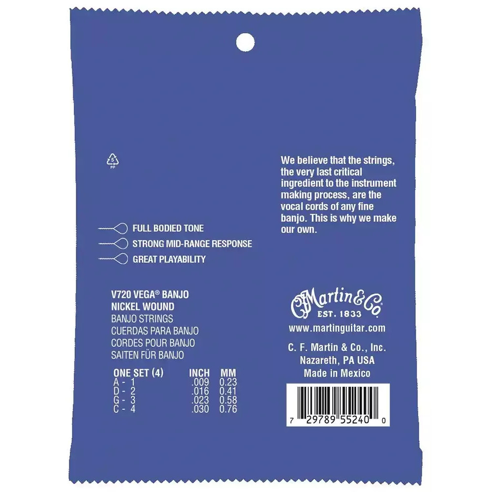 Martin V720 Vega Tenor je sada strun pro 4strunné tenorové banjo. Jedná se o struny z nikl/ocelové slitiny. Nabízejí dlouhou životnost, příjemnou hratelnost a kvalitní, plný zvuk se silnými středy. Jsou vhodné pro všechny styly hry na banjo. Tloušťka jednotlivých strun je .009, .016, .023, .030. Připravil PJ