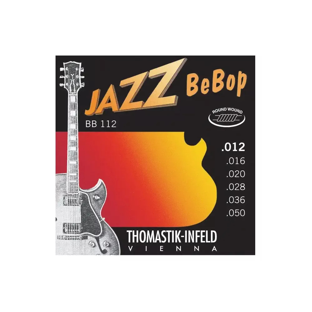 Thomastik BB 112 Jazz BebopSada šesti strun pro elektrickou jazzovou kytaru. Struny mají kulaté niklové opředení s ocelovým jádrem. Zakončeny jsou kuličkou (ball end). Síla strun je .012, .016, .020, .028, .036, .050. Struny jsou vyrobené v Rakousku. Jak již jejich název napovídá, jedná se o struny, které jsou vhodné především na lubové jazzové kytary a jejich zvuk nejlépe vynikne právě v jazzové hudbě, do které vnese silný a bohatý tón.