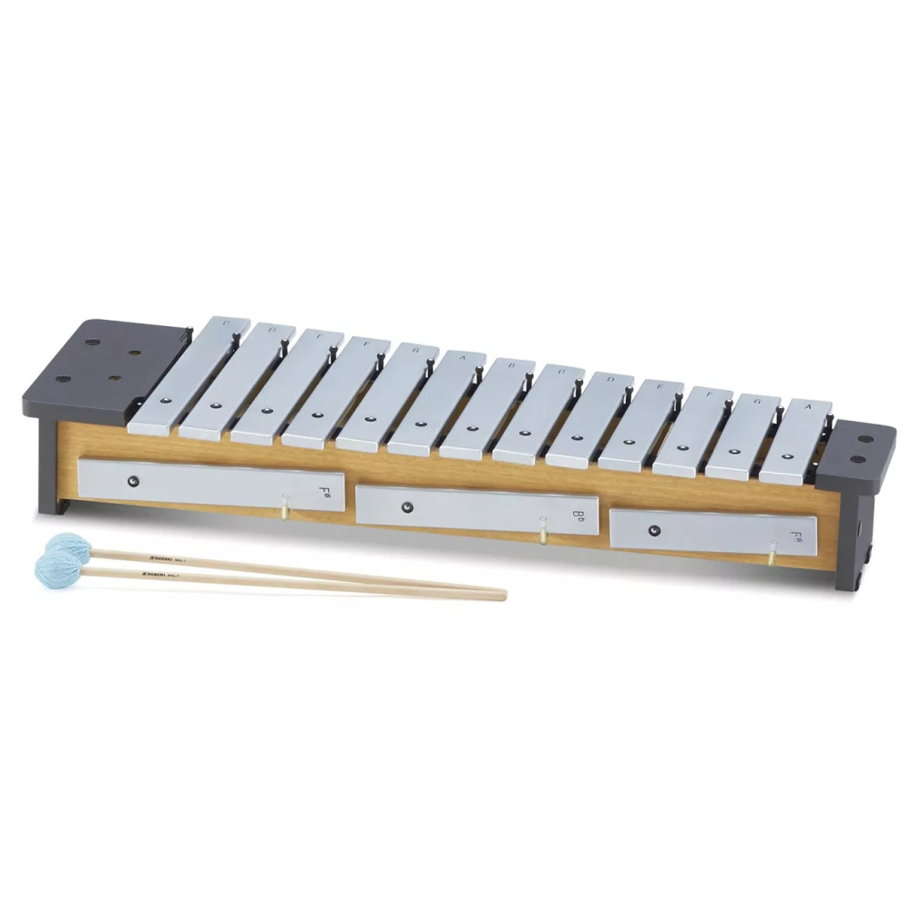 Suzuki MPS-16 je sopránový metalofon od známé japonské značky. Suzuki diatonické metalofony jsou v koncertní kvalitě. Každý kámen je vyroben z nejkvalitnější slitiny hliníku a je perfektně vyladěn pro dokonalou intonaci a harmonii. Všechny Suzuki metalofony nabízejí úložiště pro paličky, pro chromatické kameny a spodní lištu, která drží trny s označením názvu tónu uvnitř každé rezonátorové komory. Každý diatonický metalofon obsahuje jeden Bb a dva F # kameny (vyměňte je za namontované B nebo F kameny, abyste si zahráli další stupnice), a dva páry vhodných paliček, plus tlumicí lištu s nastavitelnou rukojetí. Rozsah metalofonu je C2 - A3, 16 tónů. Tento diatonický metalofon lze rozšířit dokoupením sady chromatických kamenů MPS-6. Sada obsahuje kameny c#2, d#2, g#2, c#3, d#3 a g#3. Výsledkem je pak kompletní chromatická stupnice. K dispozici je místo pro uložení chromatických kamenů, které jsou dodávány navíc, a to na boku nástroje. Specifikace Rozsah: C2 - A3 Kameny navíc: 1x Bb a 2x F# Kameny: hliníková slitina A=442Hz Dřevěný rám Rozměry: 721 x 252 x 125 mm Hmotnost: 5 kg Součástí balení: paličky MAL-1 Připravil PJ