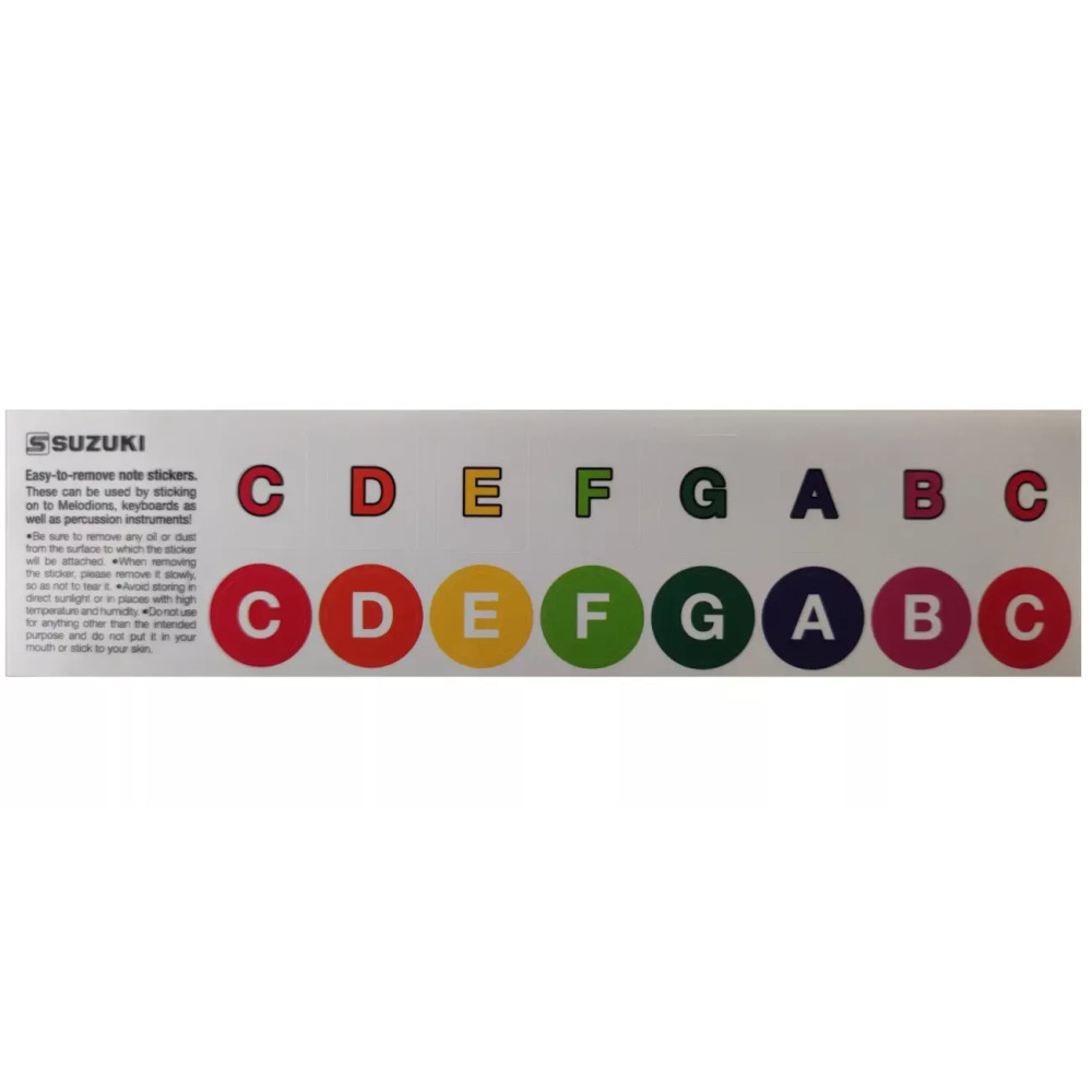 Suzuki samolepky s tóny jsou určeny pro polepení kláves keyboardů, klávesových harmonik (melodionů) nebo různých perkusních nástrojů - xylofony, metalofony atd. a slouží pro usnadnění orientace především pro malé děti. Samolepky jsou snadno odstranitelné a nezanechávají na povrchu žádné zbytky. Připravil PJ