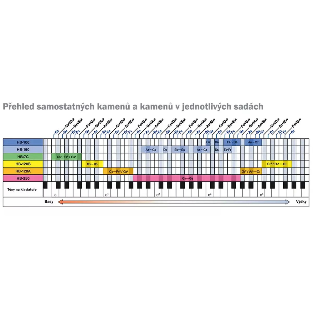 Suzuki Single Tone Chimes F#5 je jednotlivý kámen sloužící pro dolnění základních sad Tonechimes HB-100, HB-160 či HB-250. Nabízejí vysoce kvalitní hliníkové provedení. Jednotlivé tóny lze objednat v rozsahu C3 až G7, tento nabízí ladění F#5. Tyto hrací kameny jsou vhodné pro dětský soubor, do školy či školky, kde se díky nim děti skvěle seznamují z hudbou. Přehled rozsahu jednotlivých sad Suzuki Toneschimes Jak se na Tonechimes hraje? Pevně uchopte jeden hrací kámen za držadlo. basové kameny jsou těžší, můžete je tedy držet oběma rukama. Ohněte ruku k rameni a svižně ji vytrčte vpřed. Pohyb by měl být plynulý a lehký, bez použití zbytečné síly. Zvuk zastavíte dotykem špičky kamenu o tělo nebo o dlaň. Případně lze na stůl položit například ručník a kámen na něj položit. Připravil PJ