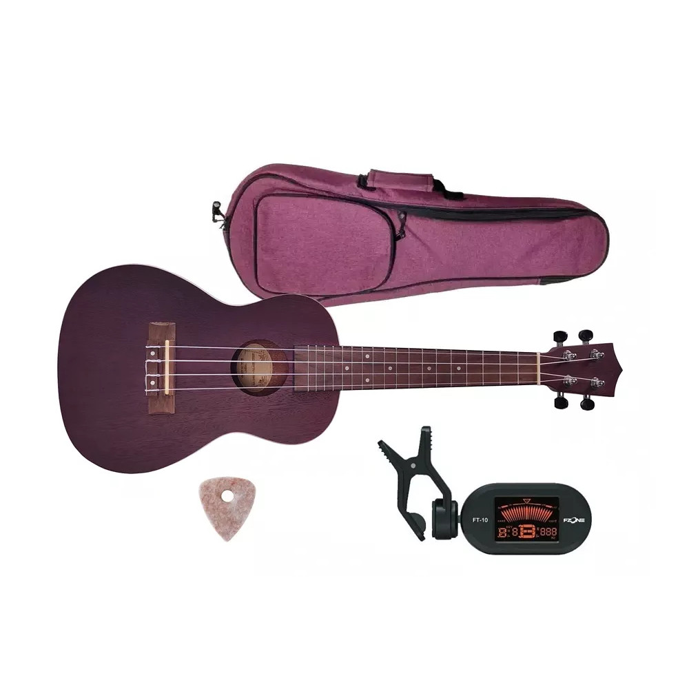 FZone FZU-06C VT SET3 je sada obsahující koncertní ukulele s mahagonovou deskou ve špičkové kvalitě, povlak FZone CUB-7C, ladičku Fzone FT-10 a trsátko pro ukulele za výhodnou cenu. Luby a záď nástroje jsou vyrobeny také z mahagonu. Hmatník a kobylka jsou ze sonokelingu. Hlava nástroje má láserově gravírované logo a tělo je ozdobeno vykládáním. Ladící mechaniky jsou uzavřené a postříbřené Grover s černými kolíky. Nástroj je osazen strunami Aquila. Výsledkem skvělého provedení a prvotřídních materiálů je krásně znějící i vyhlížející nástroj za dostupnou cenu. Barevné provedení ukulele je tmavě fialový mat.